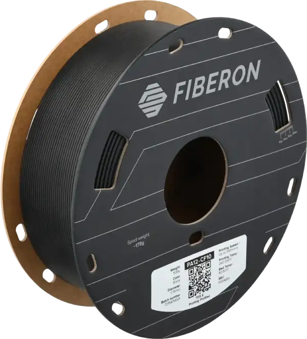 Il Fiberon™ PA12-CF10 di Polymaker è un filamento in Nylon 12 rinforzato con fibra di carbonio.